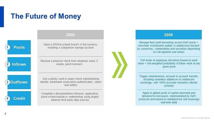 Το μέλλον του Χρήματος όπως το γνωρίζουμε. Εάν κάποιος έκανε μια έρευνα το έτος 2000 για τις εταιρίες χρηματοοικονομικής τεχνολογίας (fintech), θα κατέληγε σε ένα βασικό συμπέρασμα: Ένας αναλογικός κλάδος, στο τέλος θα γινόταν ψηφιακός. Η προοπτική ήταν πασιφανής: υπήρχε μια βιομηχανία πολλών τρισεκατομμυρίων δολαρίων,, η οποία ήταν γεμάτη με «άτομα» (τραπεζικά καταστήματα, έγγραφα, ανθρώπινη εργασία, κλπ), όταν το μόνο που χρειαζόταν, ήταν ψηφία. Η ψηφιοποίηση, εν τέλει θα μειώσει και θα εξαλείψει το κόστος χρησιμοποίησης χρηματοοικονομικών υπηρεσιών, στο μηδέν.